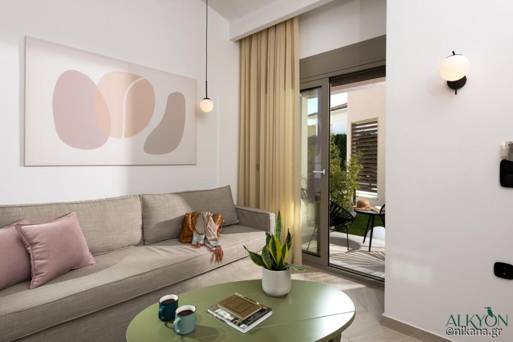 Das Hotel (bestehend aus zwei Gebäuden in einem gemeinsamen Innenhof) bietet 14 Wohneinheiten zur Miete an: drei Doppelzimmer mit Meerblick, drei Doppelzimmer mit Blick auf den Innenhof und sechs Dreibettzimmer mit Blick auf den Innenhof sowie ein Apartment (35 m²) und eine Maisonette (35 m²), eine Wohneinheit auf zwei Ebenen. Die Wohneinheiten verfügen nicht über eine Küche mit Herd.