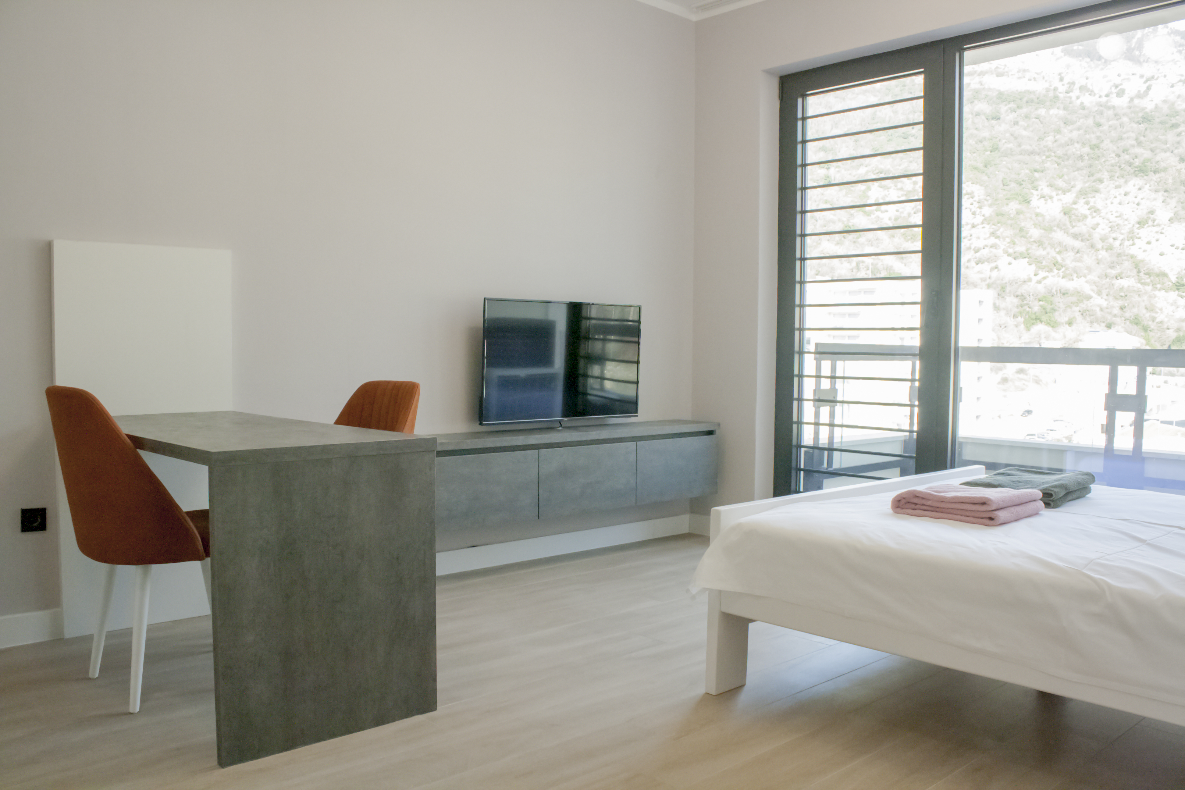 Das Studio verfügt über ein geräumiges Kingsize-Bett und einen Kleiderschrank. Der Esstisch für zwei Personen lädt zu Mahlzeiten oder einem abendlichen Drink ein. Die offene Küche ist komplett ausgestattet mit allem, was Sie zum Kochen benötigen, inklusive Geschirr, Besteck und Küchenutensilien. Das elegante Badezimmer bietet Ihnen Dusche, Waschmaschine sowie Bügeleisen und Bügelbrett. Für eine dritte Person oder ein Kind steht ein Gästebett zur Verfügung – perfekt für kleine Familien oder Gruppen, die zusätzliche Schlafplätze benötigen. Entspannen Sie sich mit WLAN, Smart-TV und genießen Sie Ihren privaten Balkon mit Blick auf die Berge und die lebhafte Straße. Der saisonale Swimmingpool steht unseren Gästen kostenlos zur Verfügung. Es gibt keine privaten Parkplätze, sondern nur öffentliche Parkplätze an der Straße.