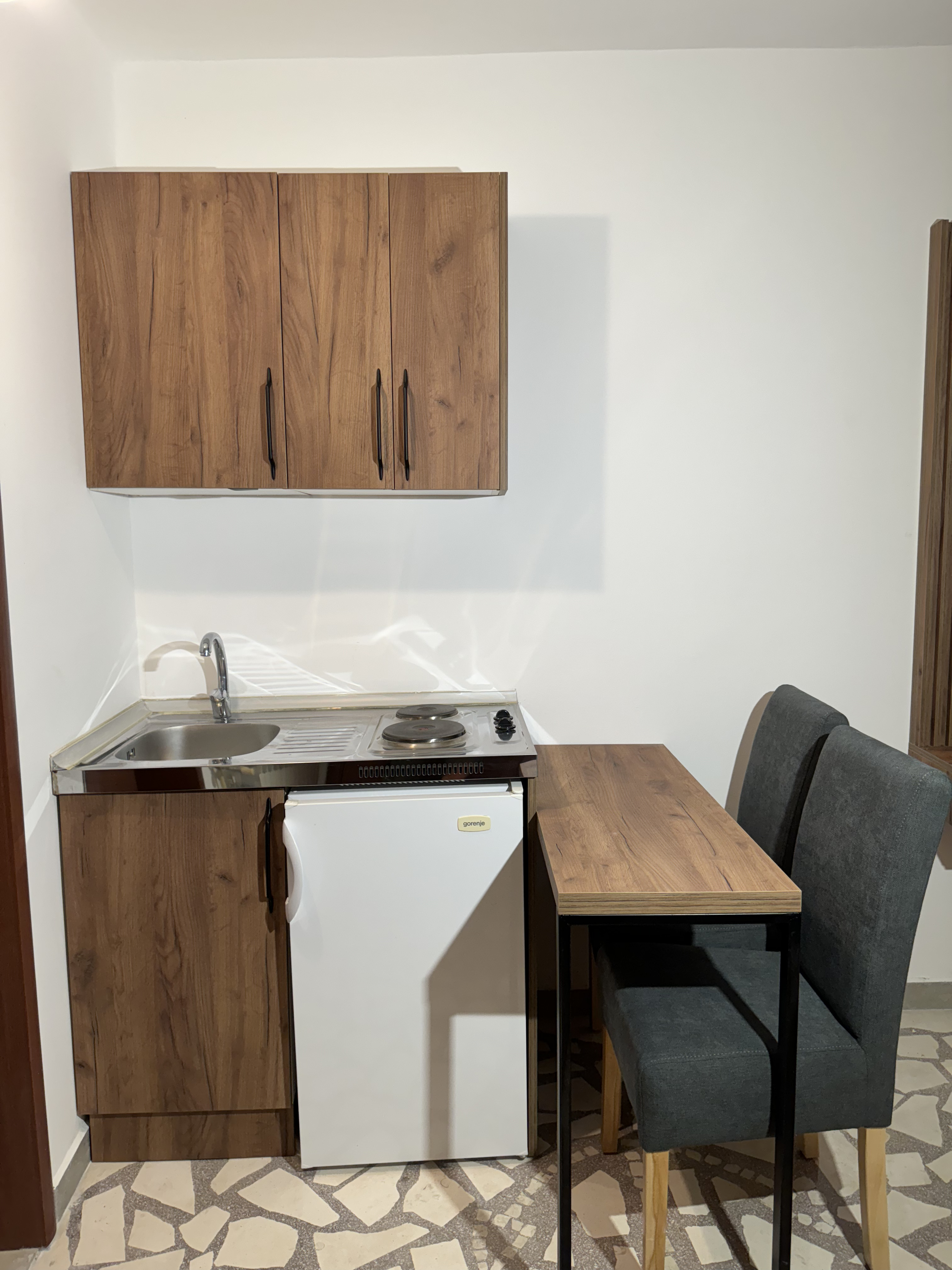 Die Kombination aus rustikalem und modernem Einrichtungsstil unterscheidet diese Wohnung von den anderen beiden. Das Studio-Apartment verfügt über eine Küche mit der notwendigen Ausstattung, ein Badezimmer und ein Zimmer mit Esstisch und Stühlen sowie einen Ruhe- und Schlafbereich. Die maximale K...