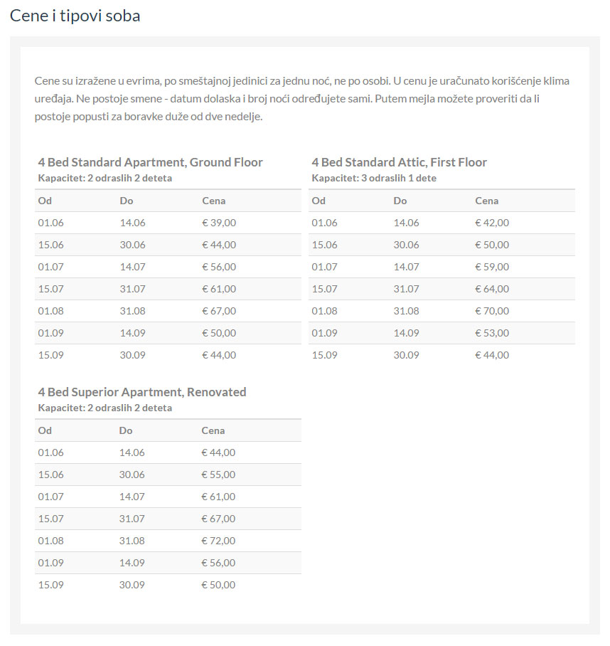 Esta instalación cuenta con un total de 14 apartamentos, siete en la planta baja y siete en el primer piso. Dos apartamentos han sido completamente renovados y los baños tienen duchas. Otros baños tienen bañeras con cortinas.