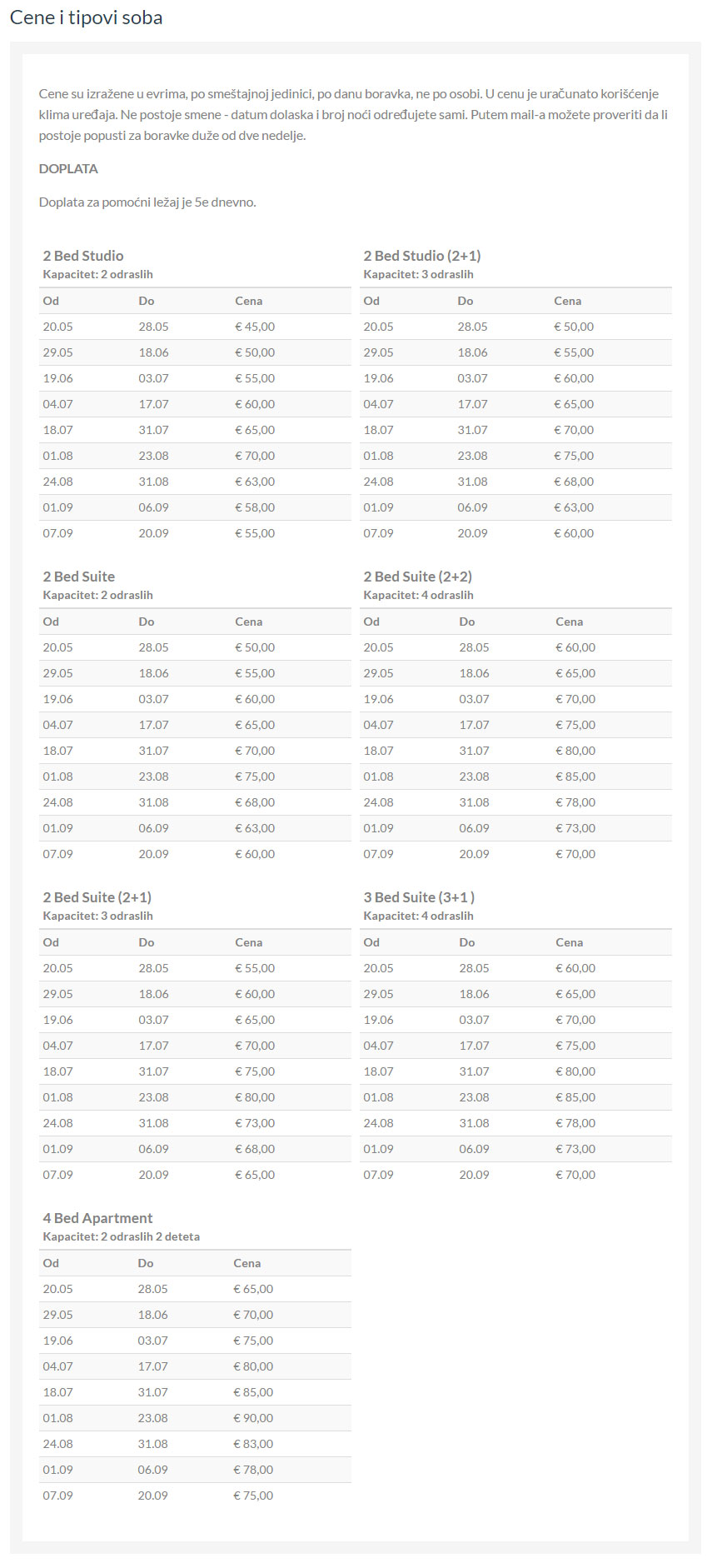 El hotel tiene un apartamento que consta de dos habitaciones, dormitorio y sala de estar y tiene capacidad para 3-4 personas. Hay habitaciones dobles y triples tipo suite. Los estudios en cuestión son más cómodos y modernos que los demás.
