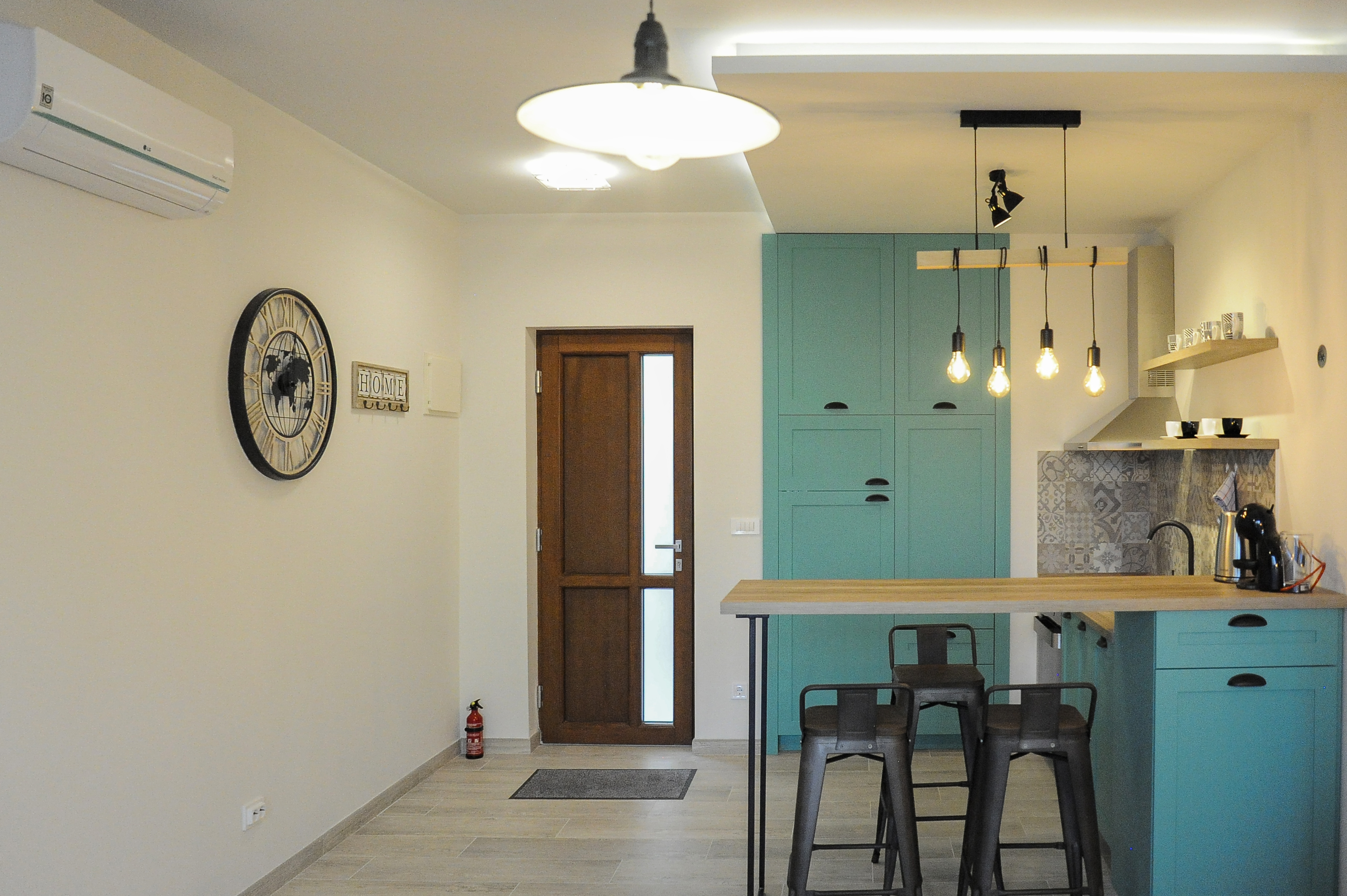 El apartamento tipo estudio No. 1 está ubicado en la planta baja con salida al jardín. El apartamento tipo estudio mide 30 m2 (el tamaño del baño es de 4 m2). La capacidad es de 2+1 camas.