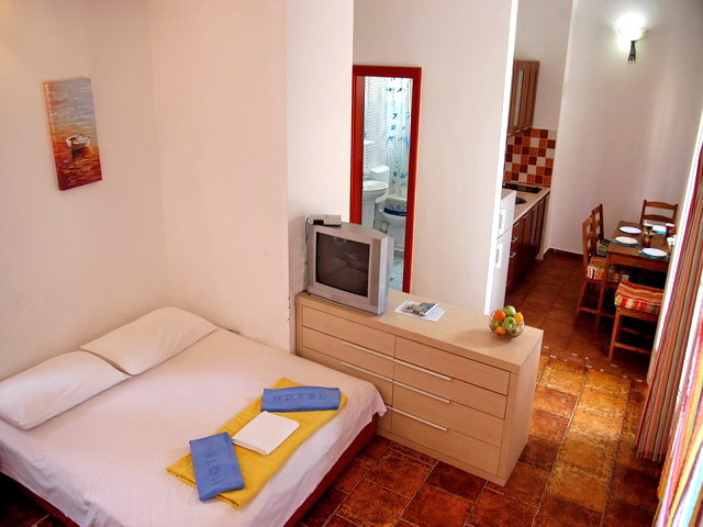Apartamentos (estudio) de 28 m2, dos en planta baja, primer y segundo piso. Se diferencian únicamente en los colores que predominan en su interior (verde, amarillo y naranja), incluyen un dormitorio equipado con TV LCD con conexión por cable, aire acondicionado, cama doble y cama extra (sofá cama...