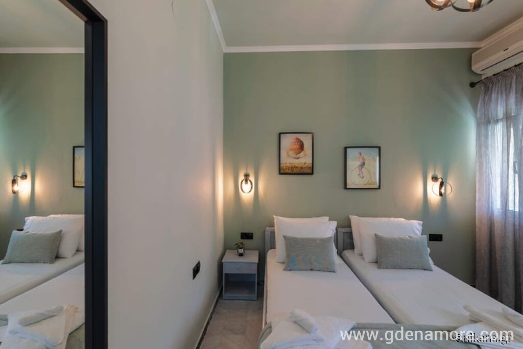 Ci sono due camere doppie al piano terra. Di fronte a ciascuna camera c'è un tavolo e sedie per il riposo. Ci sono altre due camere al primo piano, tutte dotate di due letti singoli. Il balcone al piano superiore è in comune e offre una vista parziale laterale sul mare. Tutte le camere hanno la possibilità di aggiungere un terzo letto supplementare.