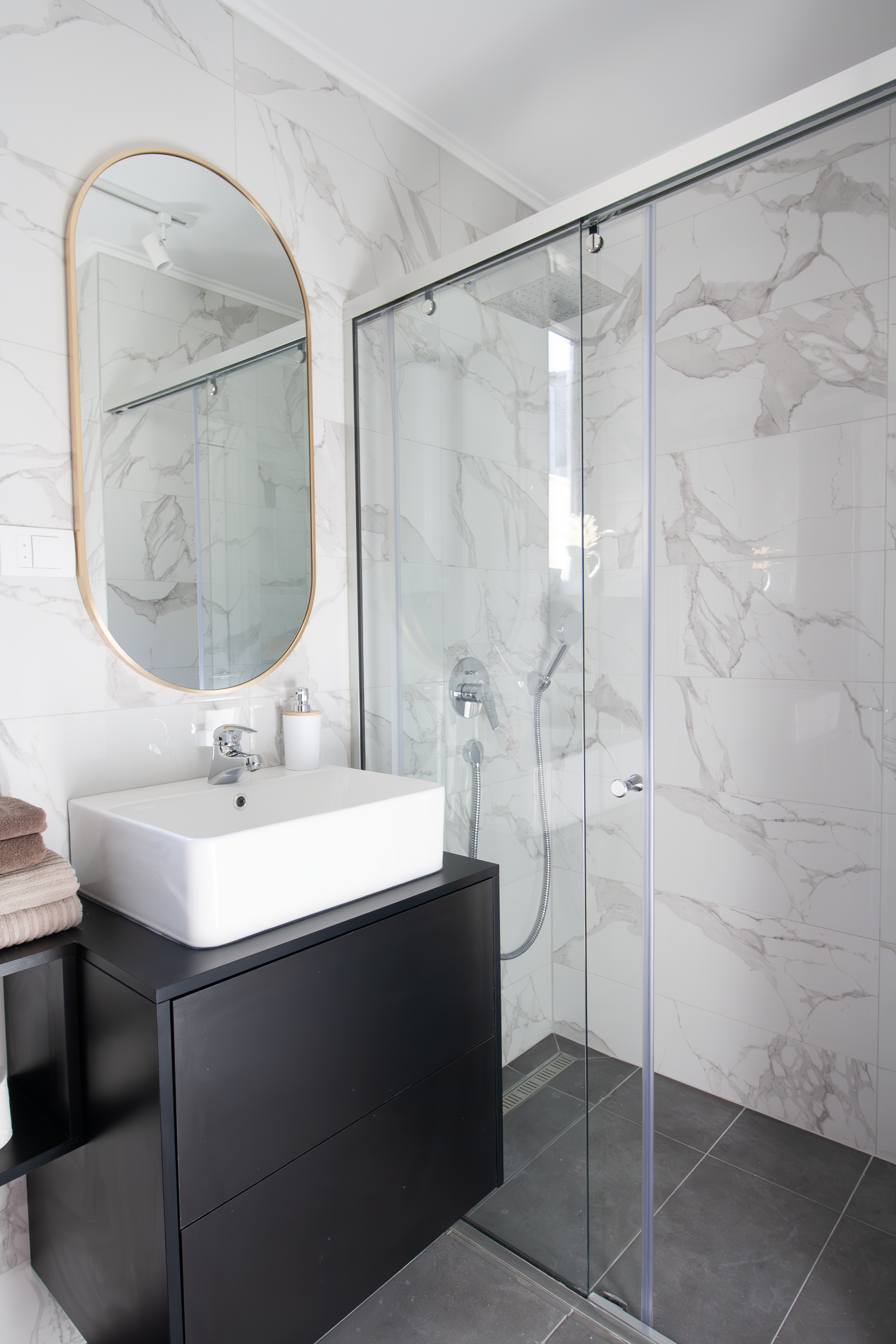 Bagno: elegante e funzionale con cabina doccia e lavatrice.
