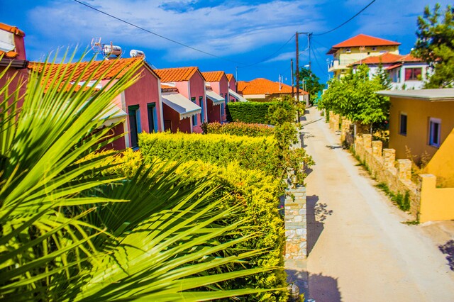 Overnatting ligger på stranden i Skala Potamia, like bak Arion Hotel.