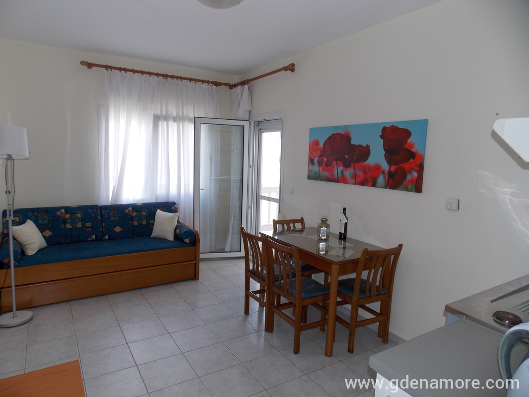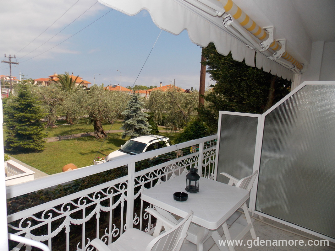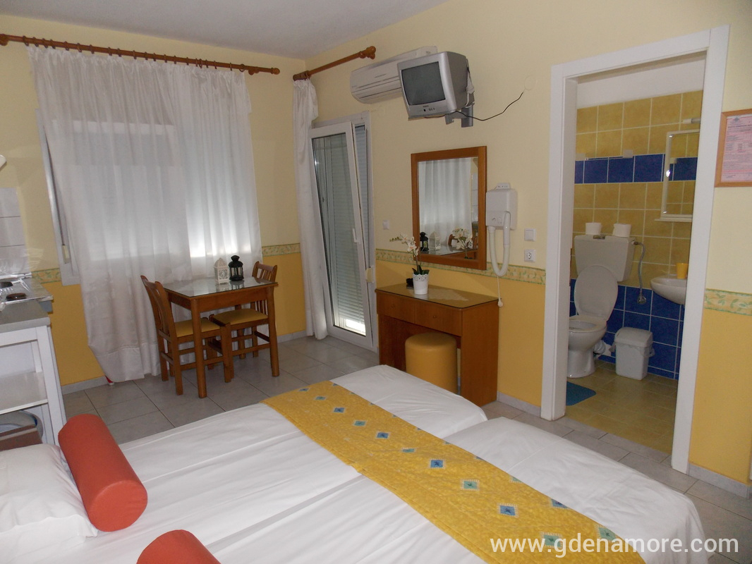Når du går av fergen følger du retningen til høyre og kjører langs sjøen på hovedveien (ca. 300m). Når du kommer til delen der den smale veien fører rett til Hotel Vournelis og stranden med samme navn, fortsett på hovedveien og ta til venstre. 150m senere kommer du til det første store veikrysset (med Dimitriadu Street) og tar til venstre der. Ioli Apartments ligger 200 meter etter svingen, på høyre side av gaten (på veien fra Limenas til Prinos, på hjørnet, etter bensinstasjonen og Paradise Studios).