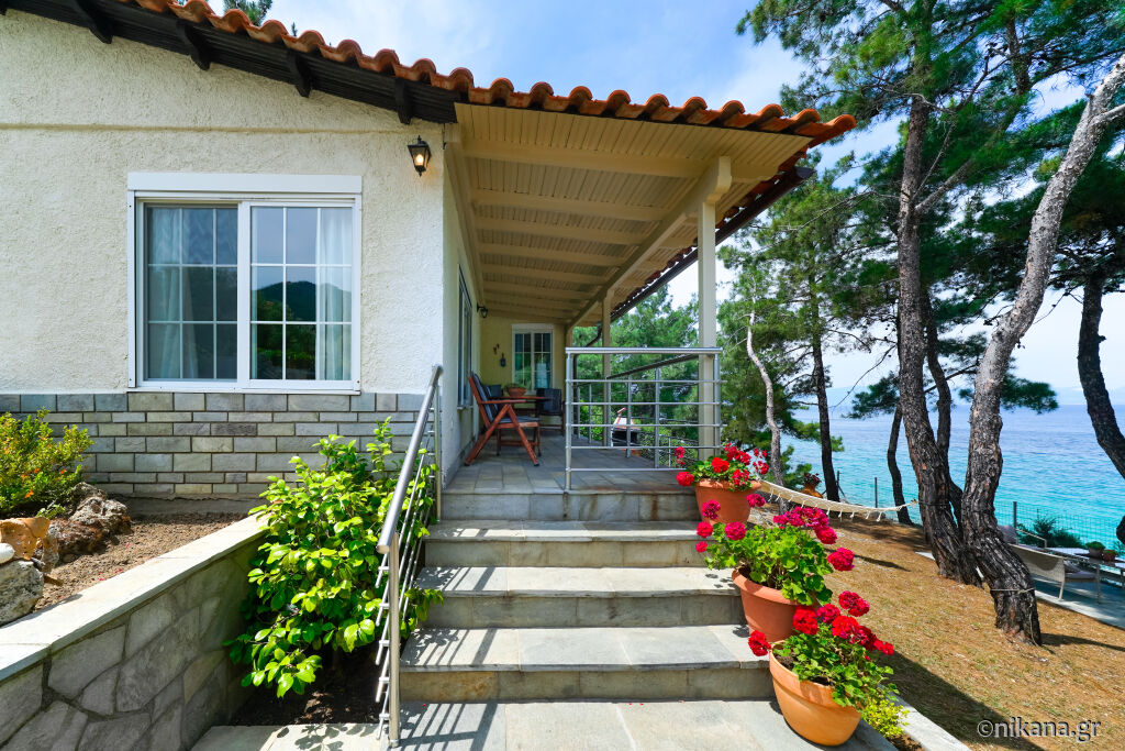 Veranda opremljena garniturom za sedenje iz koje se ulazi u kuću nalazi se na visokom prizemlju (četiri stepenika iznad nivoa dvorišta), ograđena je i sa prelepim pogledom na more.