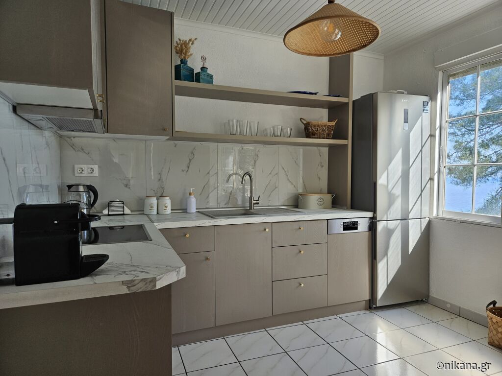 Kuhinja je prostrana i kompletno opremljena šporetom sa rernom, mašinom za pranje sudova, velikim frižiderom sa zamrzivačem, mikrotalasnom pećnicom, aparatom za kafu, tosterom, kuvalom, kao i svim neophodnim priborom i posuđem za jelo i kuvanje.